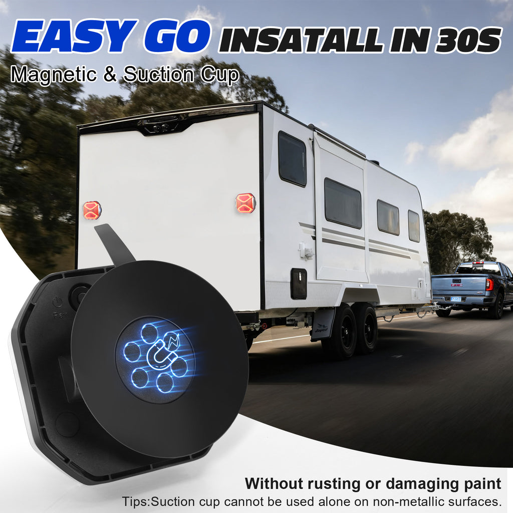 【Upgraded Warning Modes】The wireless trailer brake lights feature 64 high-brightness LEDs and offer four function modes: taillight, left turn signal, right turn signal, and upgraded multiple flashing function modes, including single, double, triple, slow single, slow double, quad, quint flashes, and alternating double/triple flashes