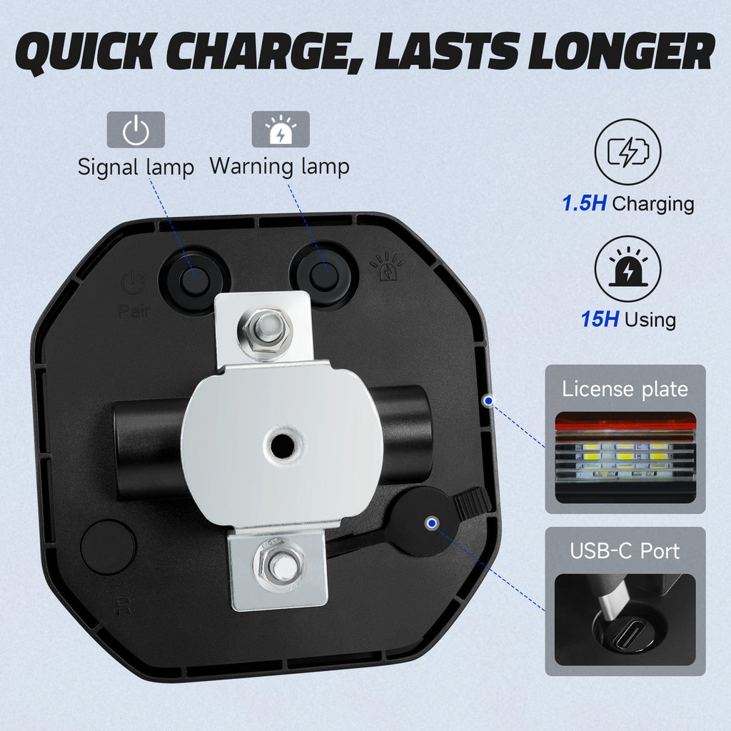 【Rapid Charging】Upgraded USB-C port charges wireless towing lights safely and efficiently in just 1.5 hours, delivering 15 hours of continuous use. Compatible with 12V/24V systems for trucks, RVs, tractors, and camiones